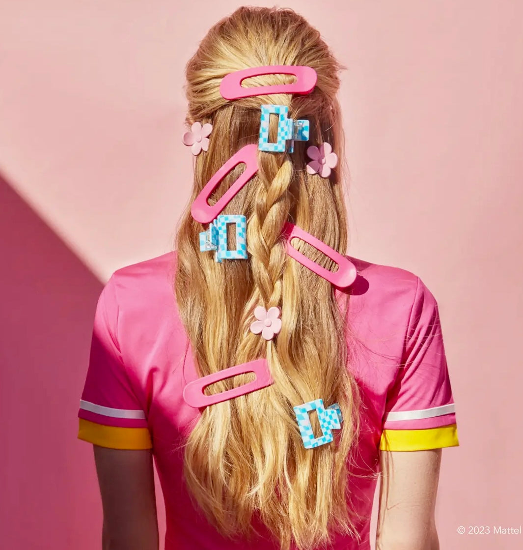A trio of hair clips in a range of sizes, sunny colors, and fun patterns inspired by Barbie, the fashion icon -Style for days! Features a matte flat lay claw clip (for breezy updos), a medium open shape claw clip (for an easy full or half-up look) & a flower-shaped mini claw clip.